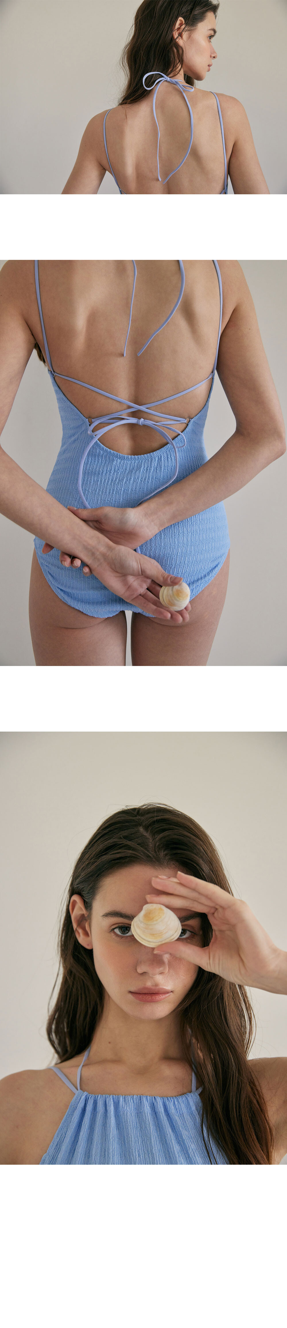 홀터넥 디자인으로 목, 등 쪽의 두개의 끈으로 베이직하지만 페미닌한 감성의 디자인으로,