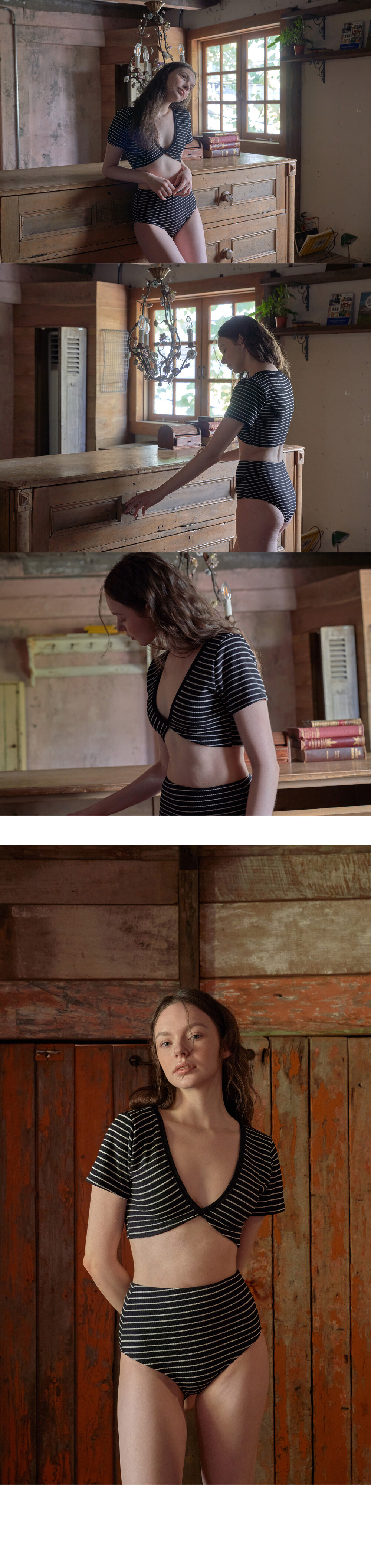하프 슬리브탑과 하이웨스트 팬츠 디자인으로 키치하면서도 고급스러운 분위기의 스윔웨어입니다.