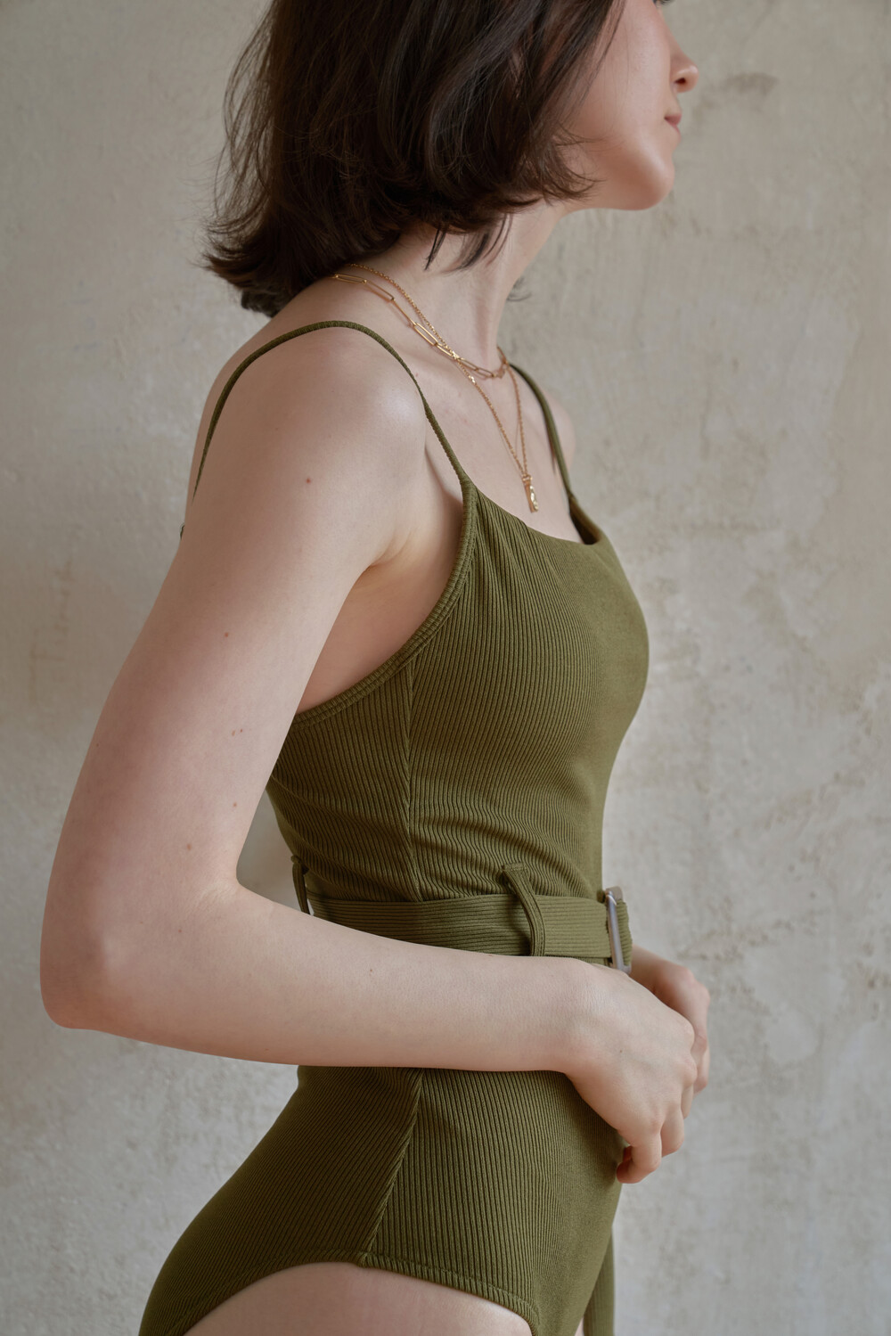 벨트 디테일의 골지 니트 원피스 수영복입니다.