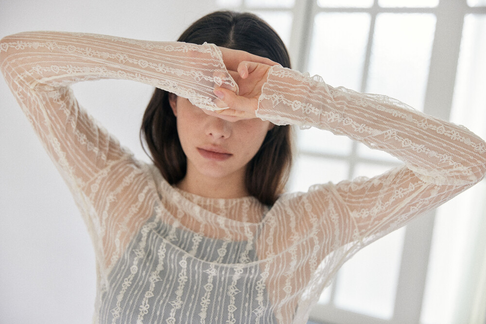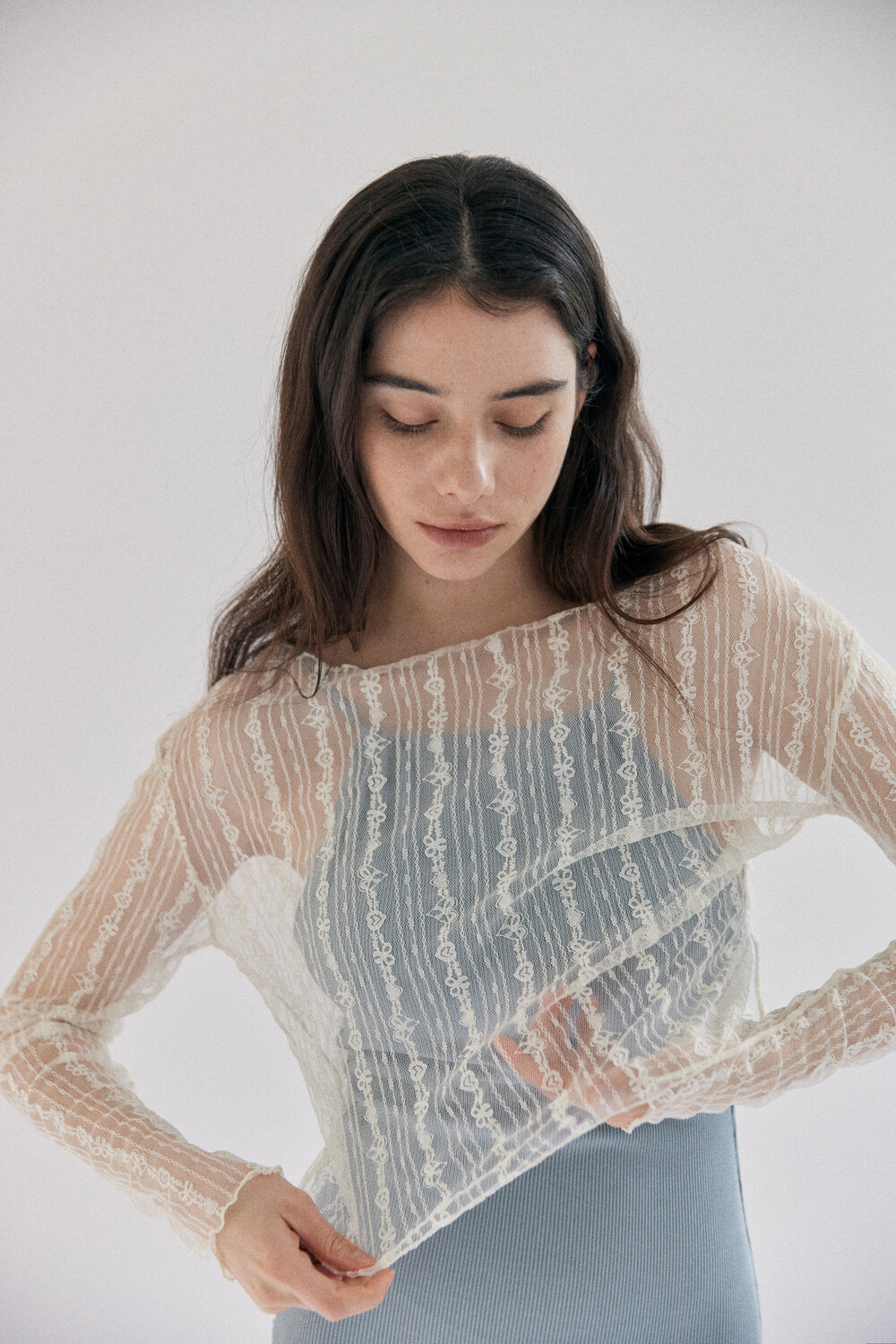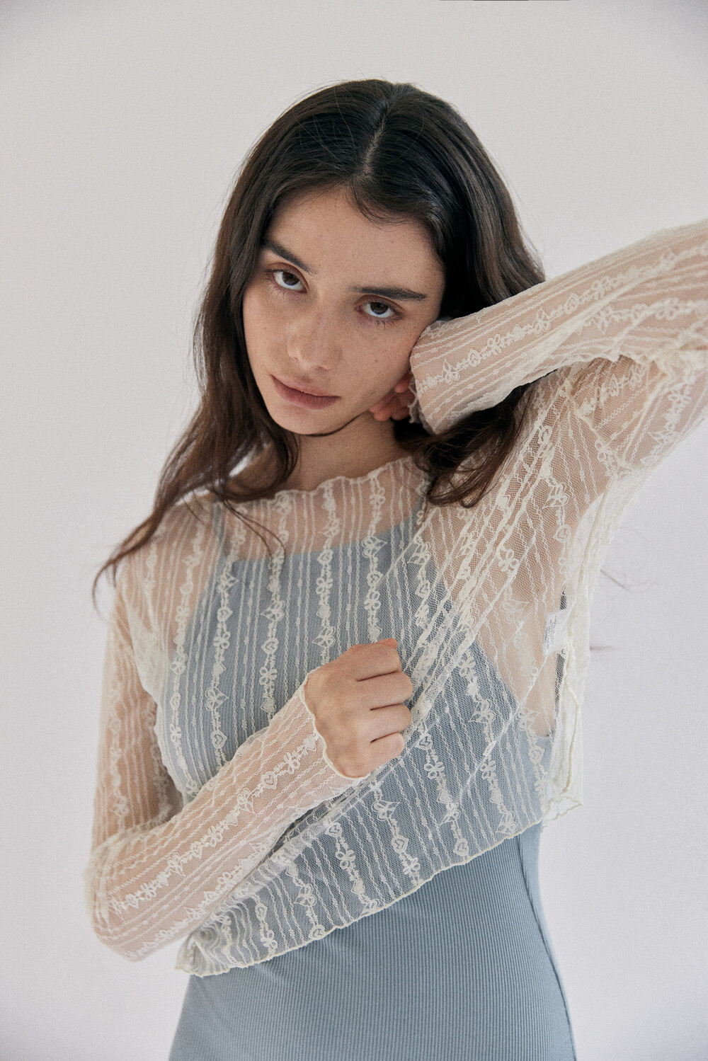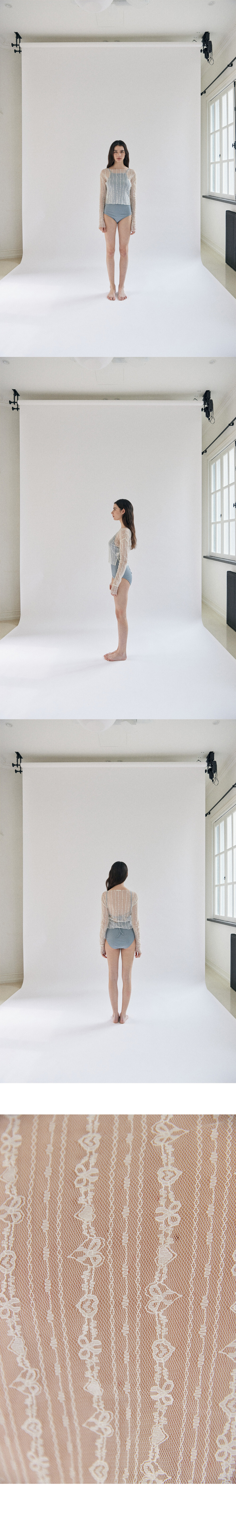 커버업으로 활용할 수 있는 레이스 슬릿 탑입니다.