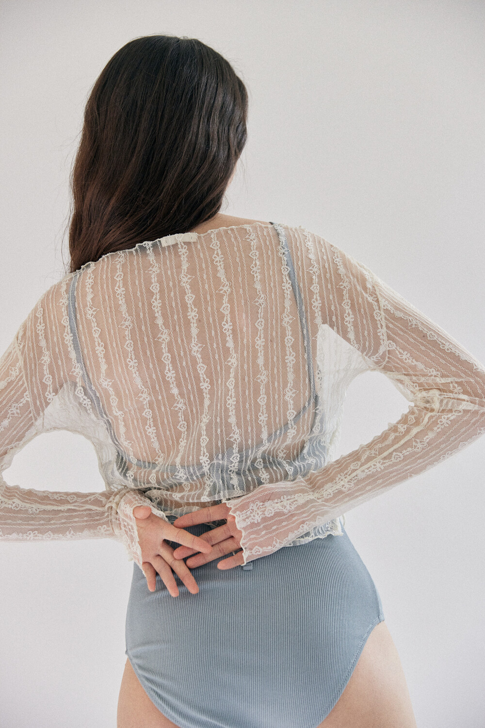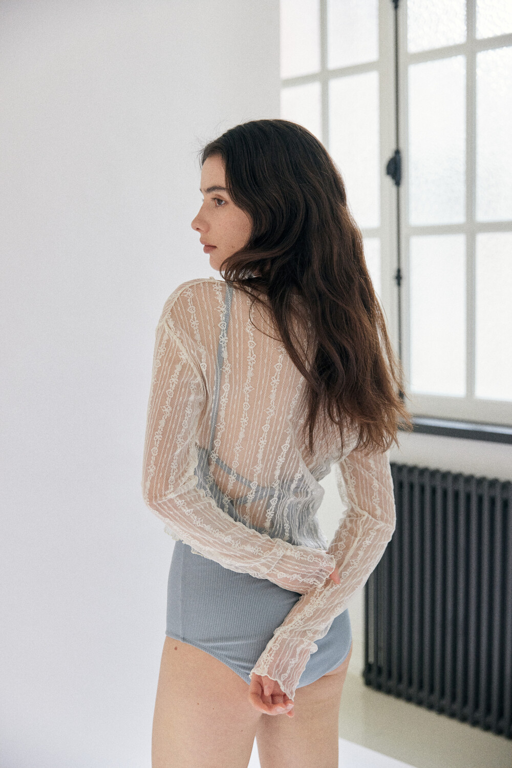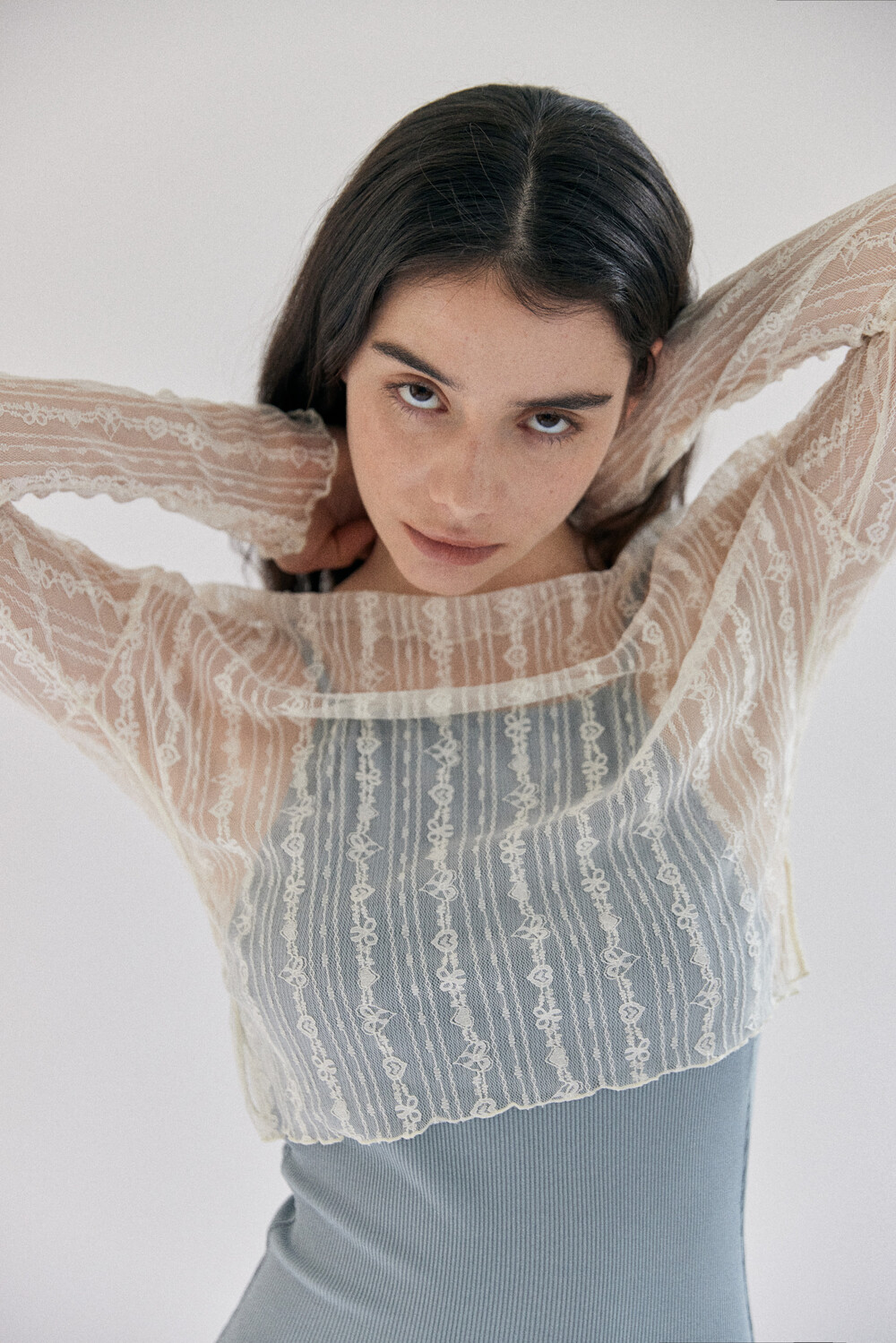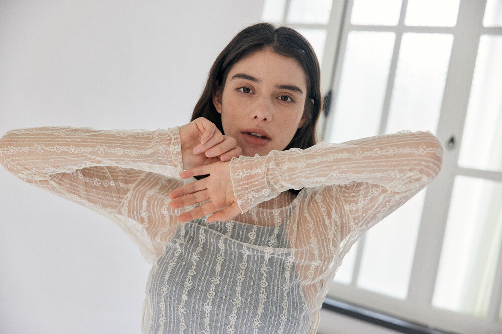 커버업으로 활용할 수 있는 레이스 슬릿 탑입니다.