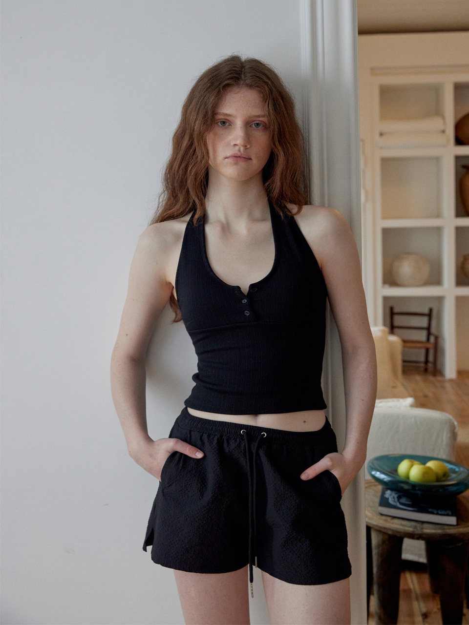 목 뒤 단추로 기장 조절이 가능한 홀터넥 디자인으로 체형에 맞게 핏을 조절할 수 있어요.