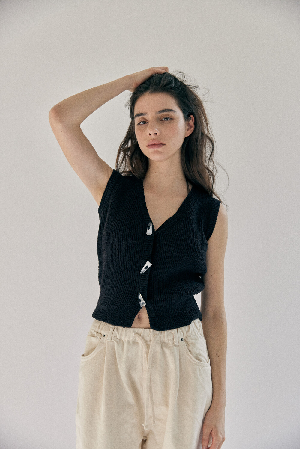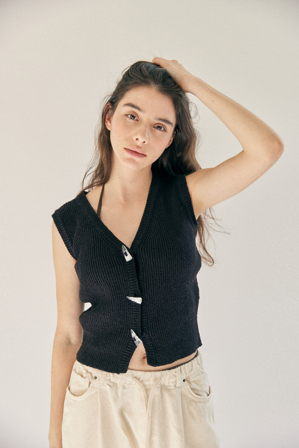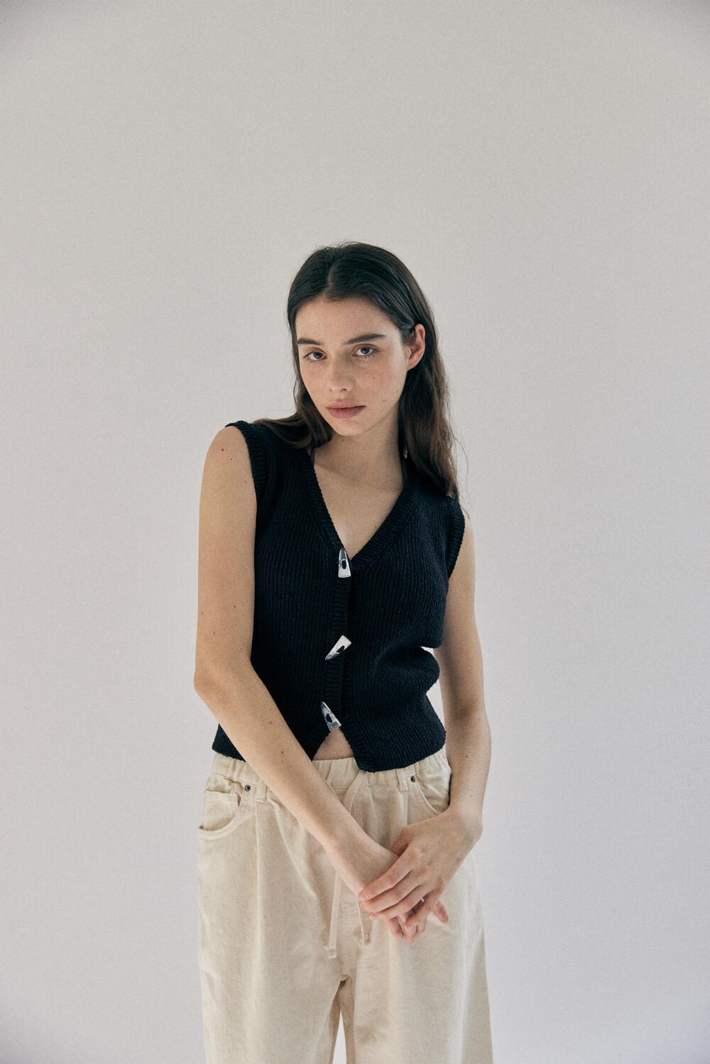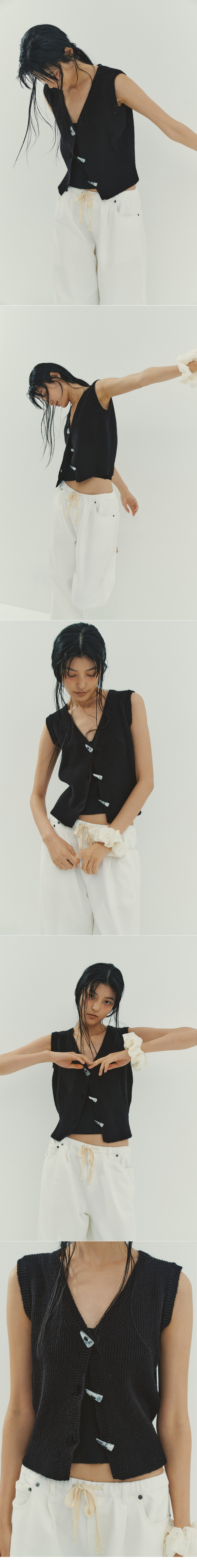 물빛을 담은 마블링 토글 단추를 사용한 브이넥 베스트 가디건 입니다.