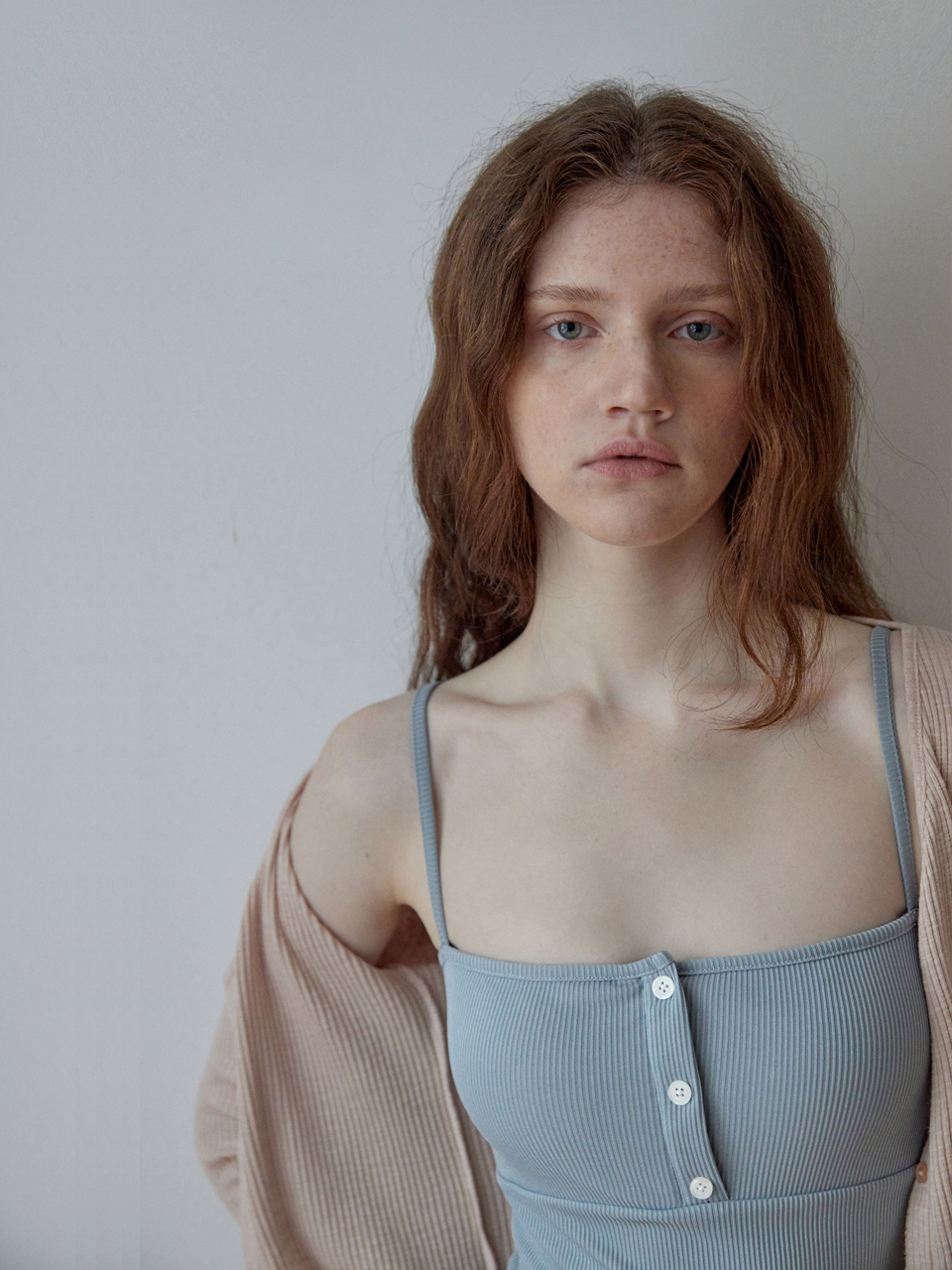 페이크 단추 디테일이 골지 텍스쳐와 만나 빈티지한 무드를 주며,