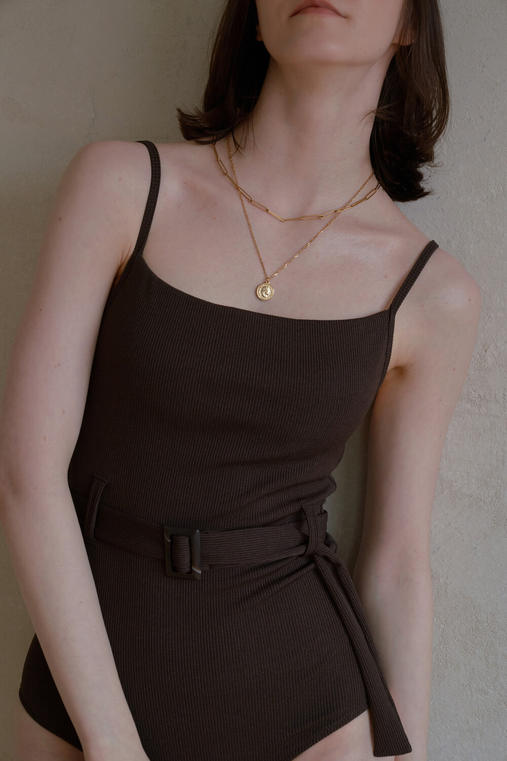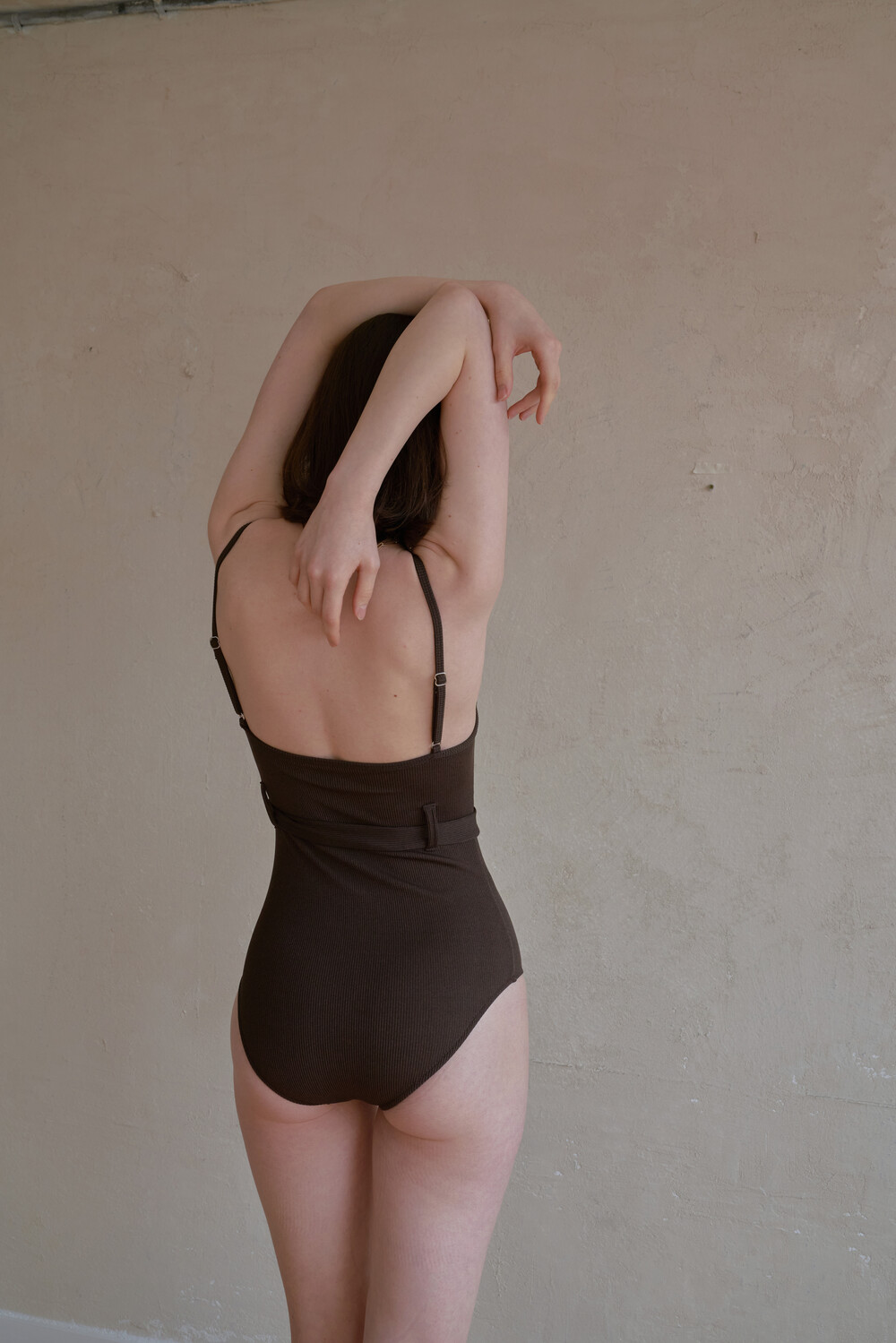 벨트 디테일의 골지 니트 원피스 수영복입니다.
