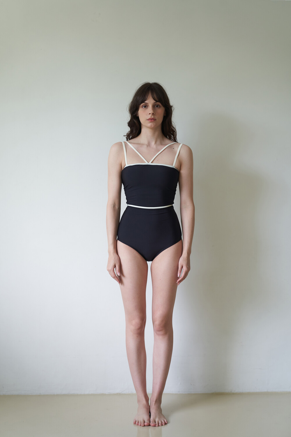 허리라인의 포인트를 약간 높게 잡아 다리가 더욱 길어보이며, 가슴 앞부분의 끈으로 두가지 연출을 할 수 있습니다.