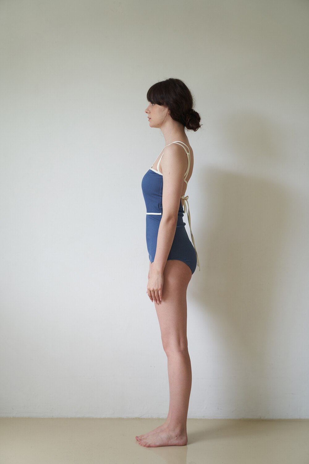 허리라인의 포인트를 약간 높게 잡아 다리가 더욱 길어보이며, 가슴 앞부분의 끈으로 두가지 연출을 할 수 있습니다.