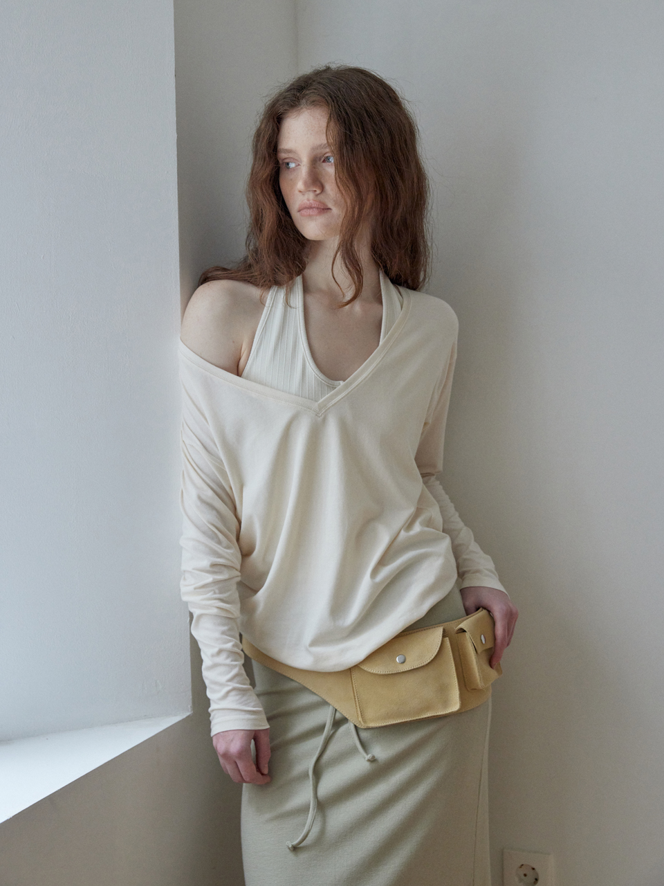 - 딥한 브이넥 라인의 오프 숄더 커버업 티