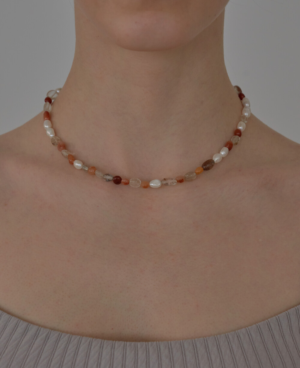 천연 원석의 한 종류인 "침수정"와 담수진주를 믹스하여 제작된 목걸이 입니다.