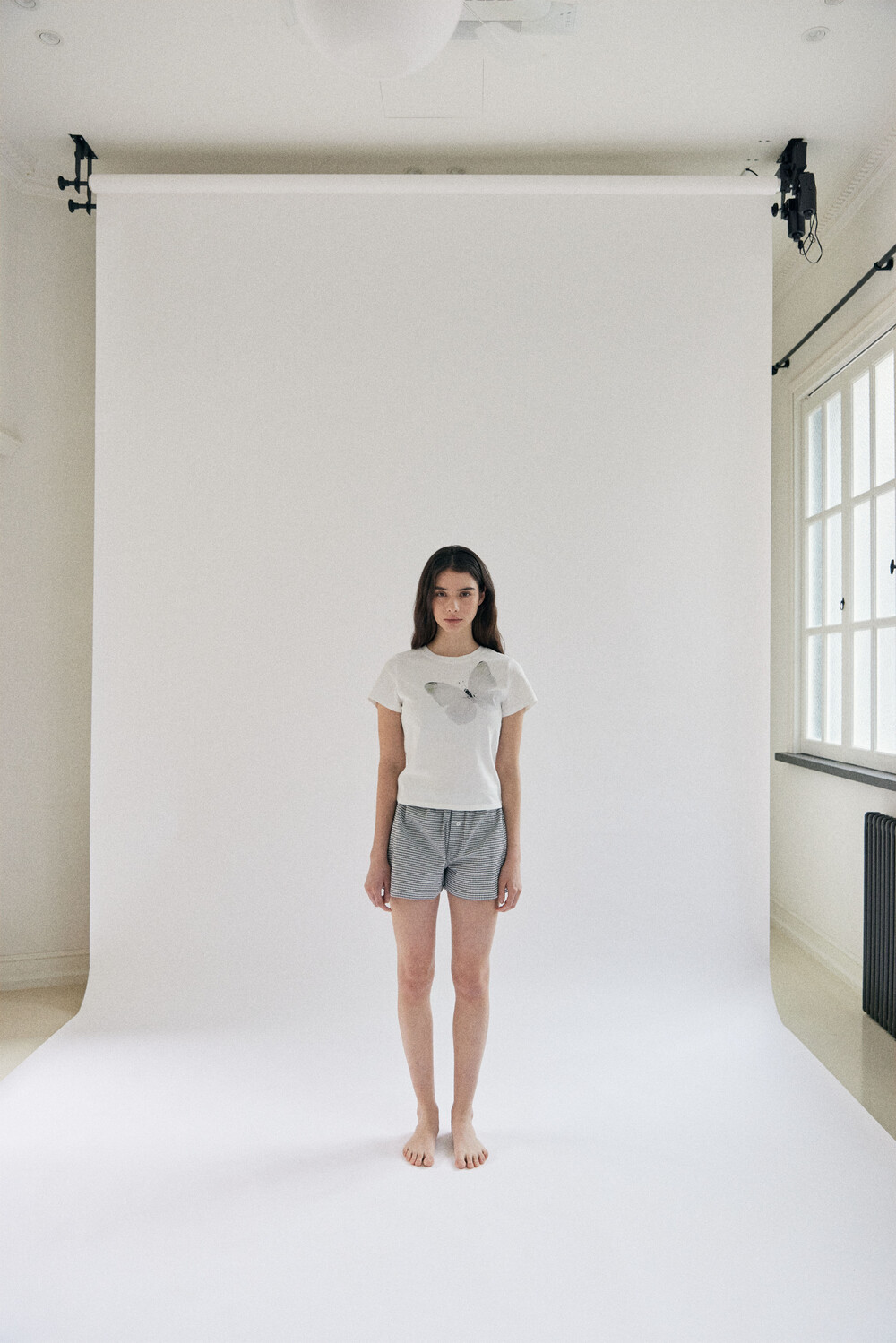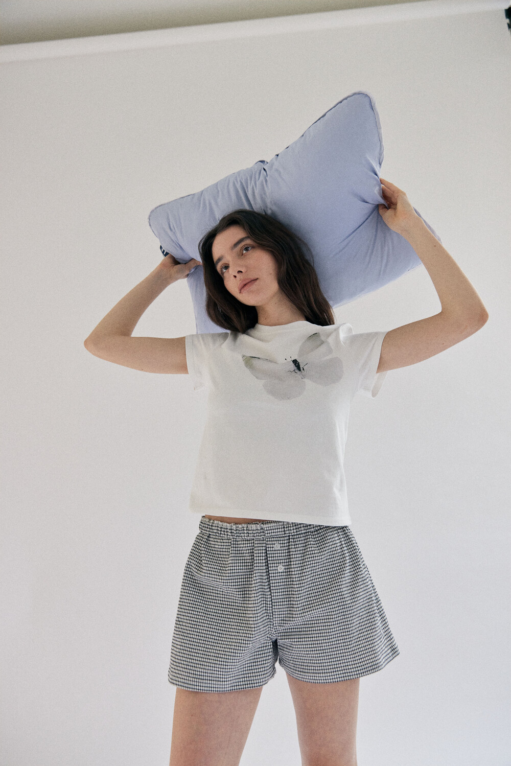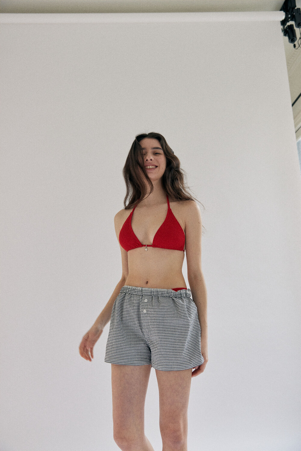 엠보싱 텍스쳐의 스판 깅엄 체크 원단을 사용하여