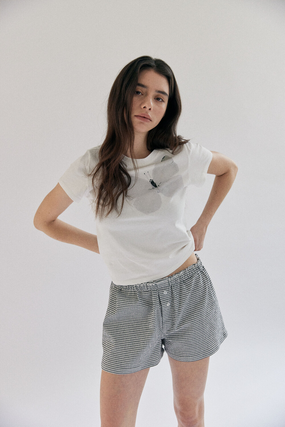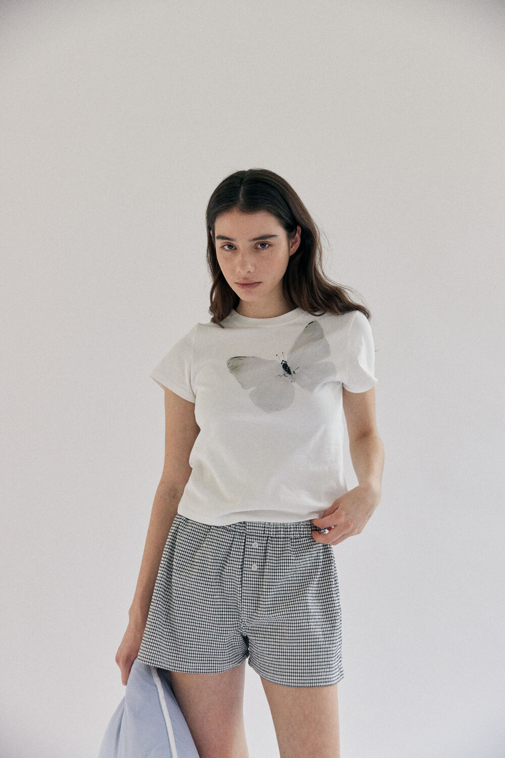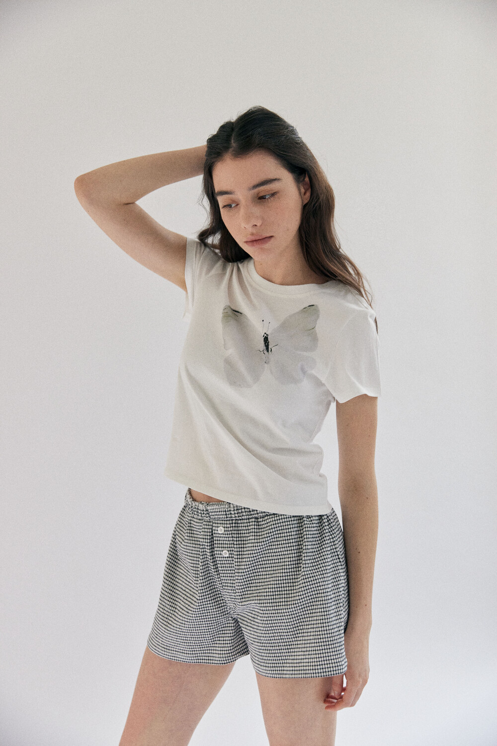 엠보싱 텍스쳐의 스판 깅엄 체크 원단을 사용하여